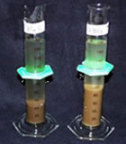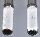 ひかり菌入り飼料と無添加の飼料をらんちゅうに与え、各々排泄した糞を取りだし、試験管にて分解速度を確認したところ、ひかり菌を添加した区は右の写真のようにわずか1日で糞が分解され、粉状になることが確認されました。これは恐らく、腸内で優占種となったひかり菌が糞と一緒に排泄され、糞中の有機物を分解したためと思われます。